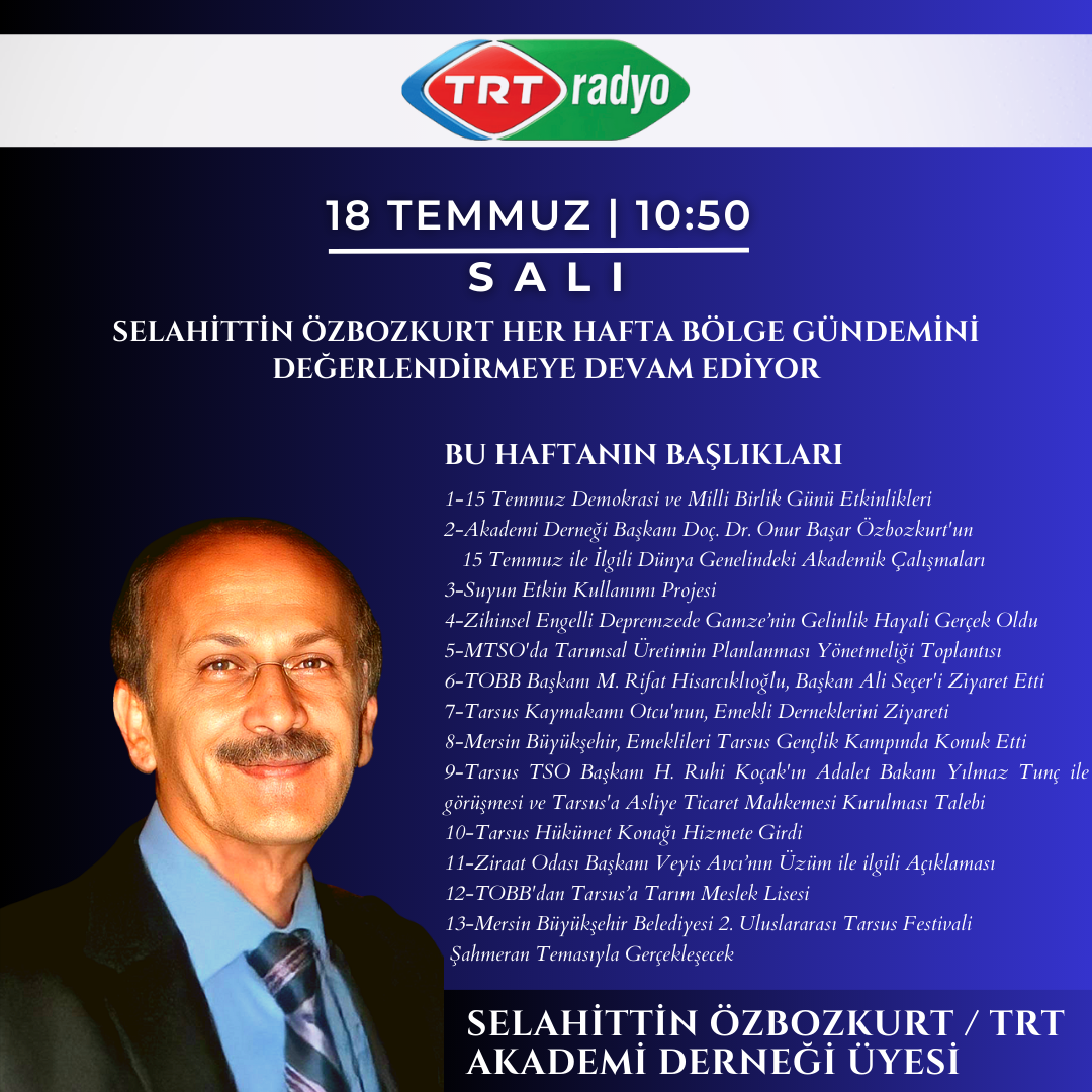 A valuable member of our Association of Academy, and an expert of the Çukurova region, Journalist Selahittin Özbozkurt continues to evaluate the agenda on TRT every week. We congratulate our member who touched on many important topics on the agenda in this week's program and wish him continued success.