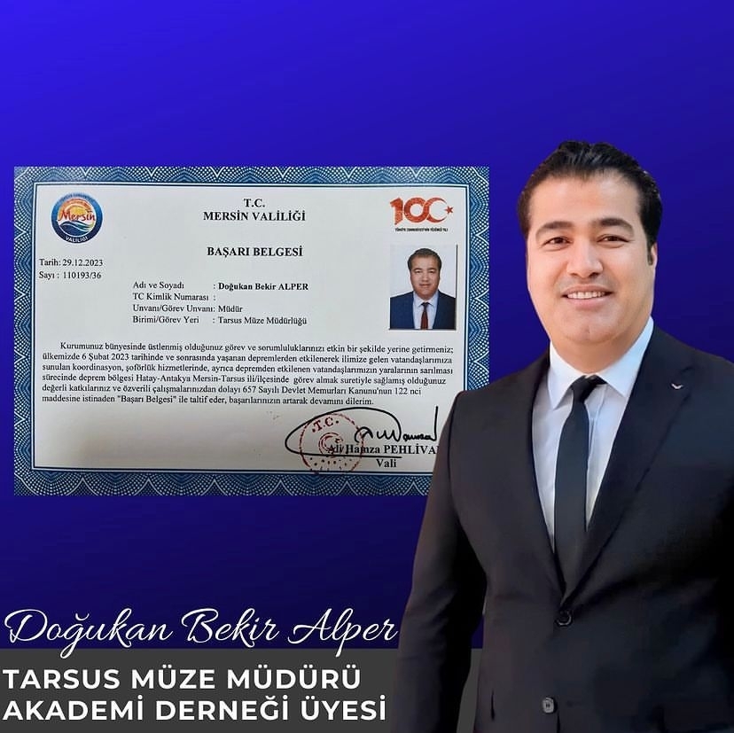 Valuable Member of our Association of Academy and Tarsus Museum Director, Archaeologist Doğukan Bekir Alper, was awarded with the "Certificate of Achievement" by our Mersin Governor, Mr. Ali Hazma Pehlivan, for his selfless work for our earthquake victims in the earthquake region Hatay and Tarsus in the earthquake that occurred on February 6, 2023.