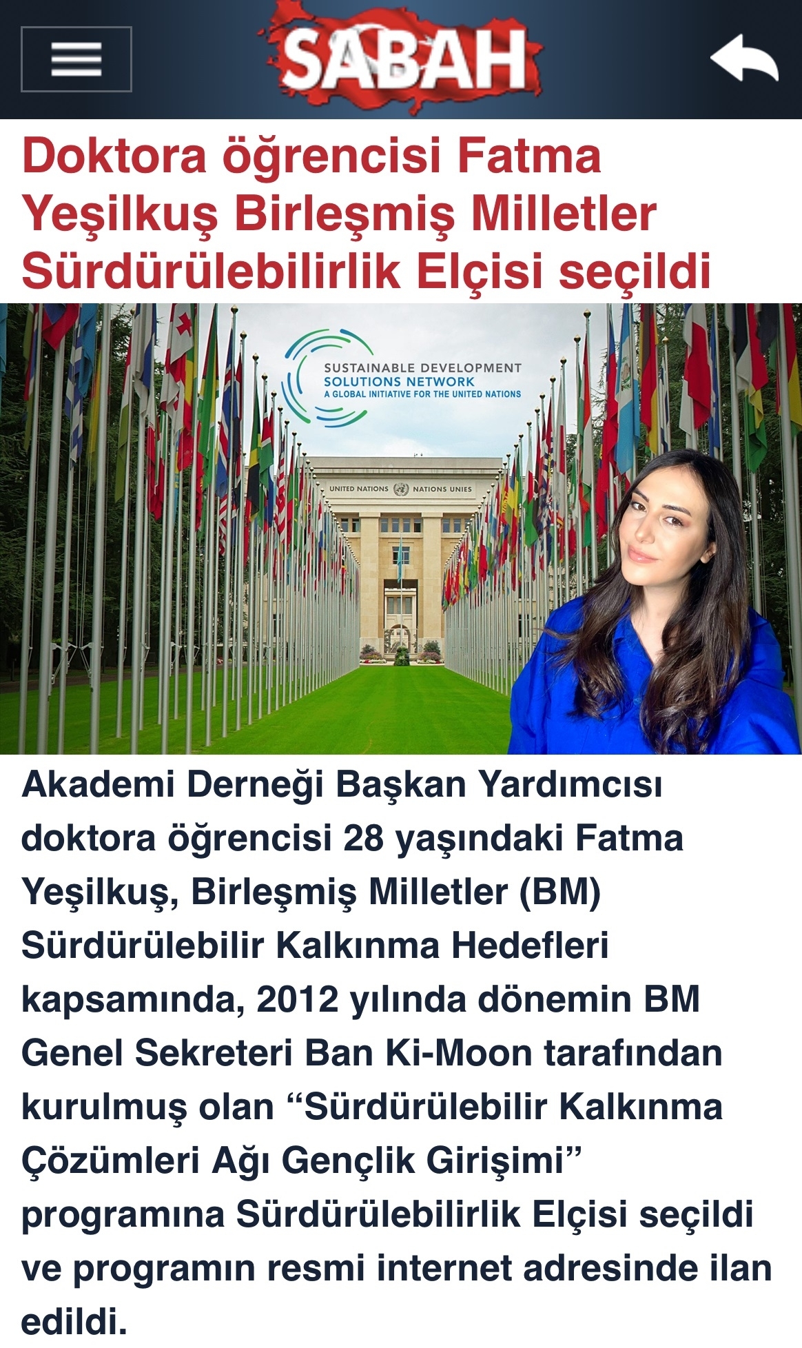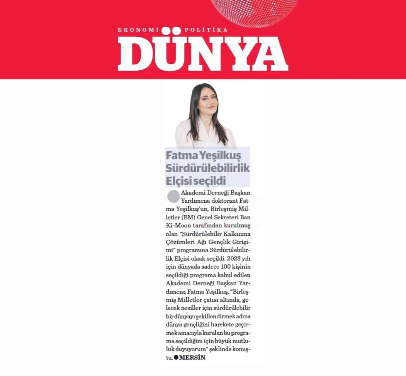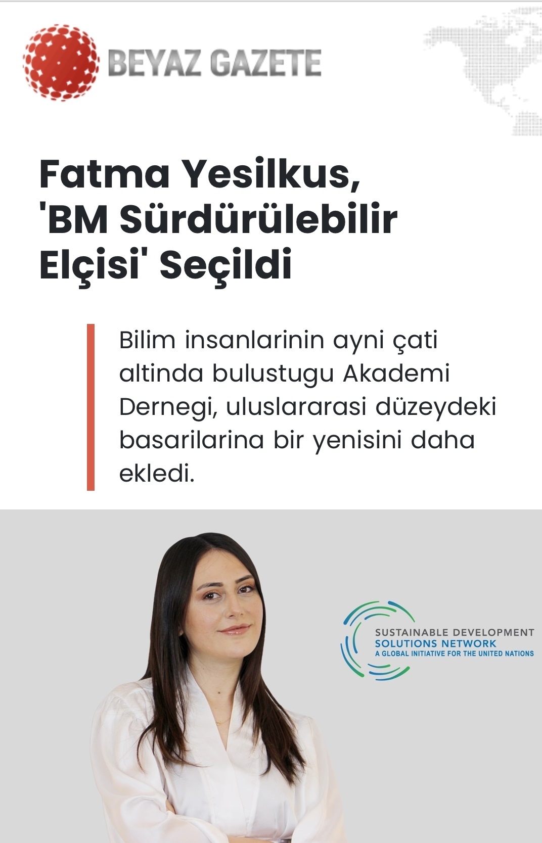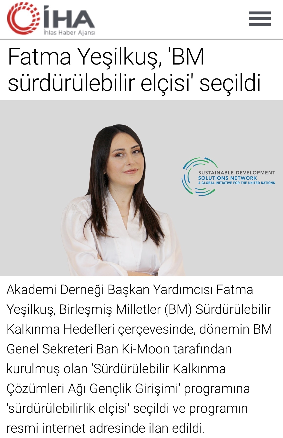 Akademi Derneği Başkan Yardımcısı doktora öğrencisi 28 yaşındaki Fatma Yeşilkuş, Birleşmiş Milletler (BM) Sürdürülebilir Kalkınma Hedefleri kapsamında, 2012 yılında dönemin BM Genel Sekreteri Ban Ki-Moon tarafından kurulmuş olan “Sürdürülebilir Kalkınma Çözümleri Ağı Gençlik Girişimi” programına Sürdürülebilirlik Elçisi seçildi ve programın resmi internet adresinde ilan edildi.