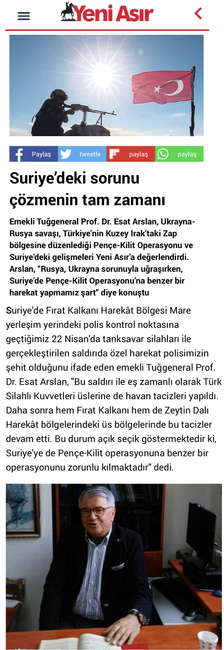 Suriye'de Fırat Kalkanı Harekât Bölgesi Mare yerleşim yerindeki polis kontrol noktasına geçtiğimiz 22 Nisan'da tanksavar silahları ile gerçekleştirilen saldırıda özel harekat polisimizin şehit olduğunu ifade eden emekli Tuğgeneral Prof. Dr. Esat Arslan, "Bu saldırı ile eş zamanlı olarak Türk Silahlı Kuvvetleri üslerine de havan tacizleri yapıldı. Daha sonra hem Fırat Kalkanı hem de Zeytin Dalı Harekât bölgelerindeki üs bölgelerinde bu tacizler devam etti. Bu durum açık seçik göstermektedir ki, Suriye'ye de Pençe-Kilit operasyonuna benzer bir operasyonunu zorunlu kılmaktadır" dedi.