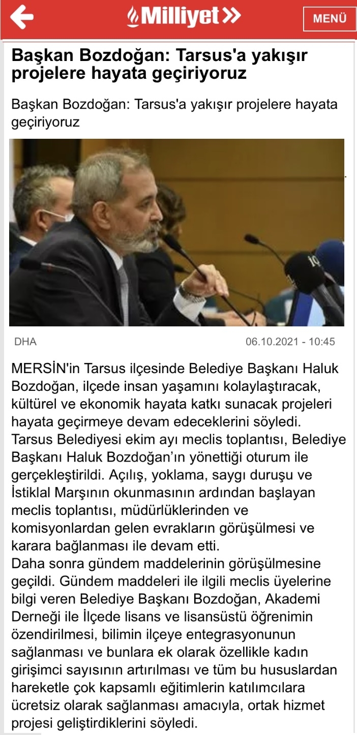 MERSİN'in Tarsus ilçesinde Belediye Başkanı Haluk Bozdoğan, ilçede insan yaşamını kolaylaştıracak, kültürel ve ekonomik hayata katkı sunacak projeleri hayata geçirmeye devam edeceklerini söyledi.