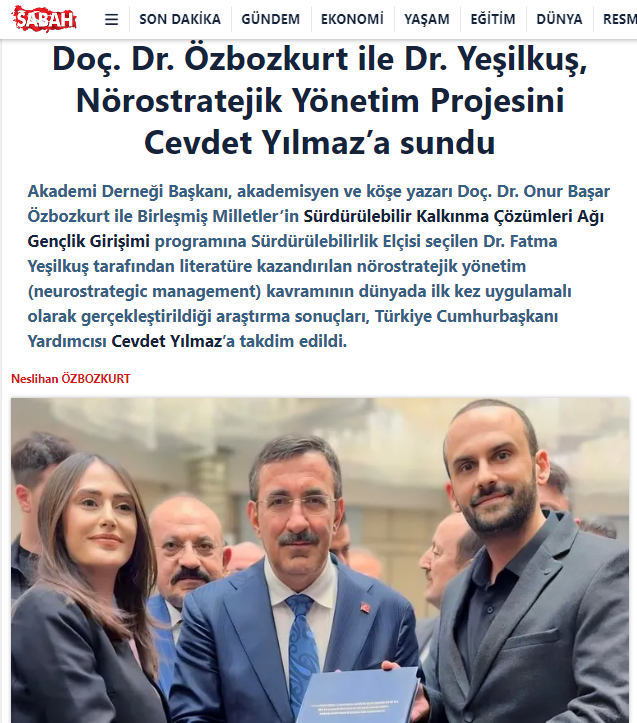Akademi Derneği Başkanı, akademisyen ve köşe yazarı Doç. Dr. Onur Başar Özbozkurt ile Birleşmiş Milletler’in Sürdürülebilir Kalkınma Çözümleri Ağı Gençlik Girişimi programına Sürdürülebilirlik Elçisi seçilen Dr. Fatma Yeşilkuş tarafından literatüre kazandırılan nörostratejik yönetim (neurostrategic management) kavramının dünyada ilk kez uygulamalı olarak gerçekleştirildiği araştırma sonuçları, Türkiye Cumhurbaşkanı Yardımcısı Cevdet Yılmaz’a takdim edildi.