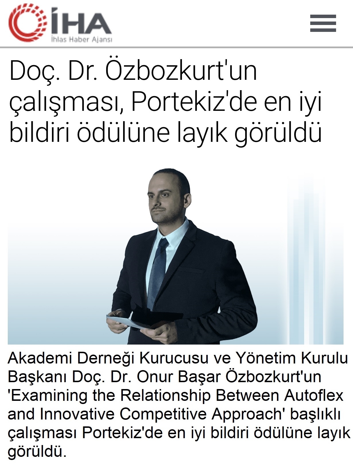 Akademi Derneği Kurucusu ve Yönetim Kurulu Başkanı Doç. Dr. Onur Başar Özbozkurt'un 'Examining the Relationship Between Autoflex and Innovative Competitive Approach' başlıklı çalışması Portekiz'de en iyi bildiri ödülüne layık görüldü.