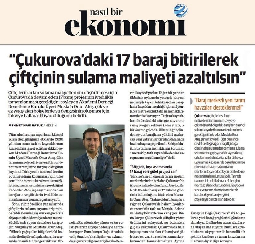 Akademi Derneği Denetleme Kurulu Üyesi Mustafa Onur Ateş, çiftçilerin yazın artan sulama maliyetlerinin düşürülmesi için devam eden baraj projelerinin ivedilikle tamamlanması gerektiğini söyledi. Ateş, çok ve az yağış alan bölgelerde su dengesinin oluşması için de barajlar arasında takviye hatlarına ihtiyaç olduğunu belirtti.